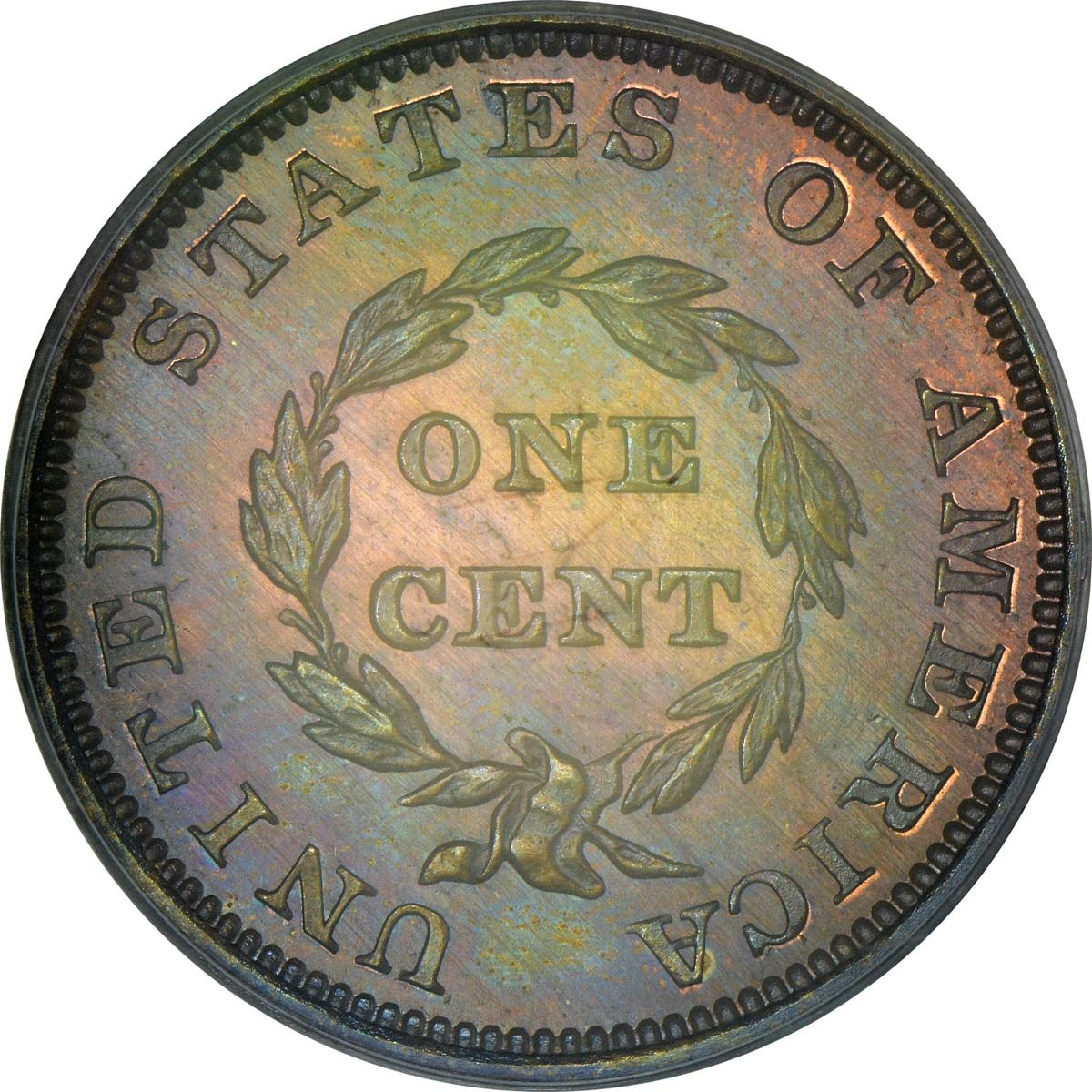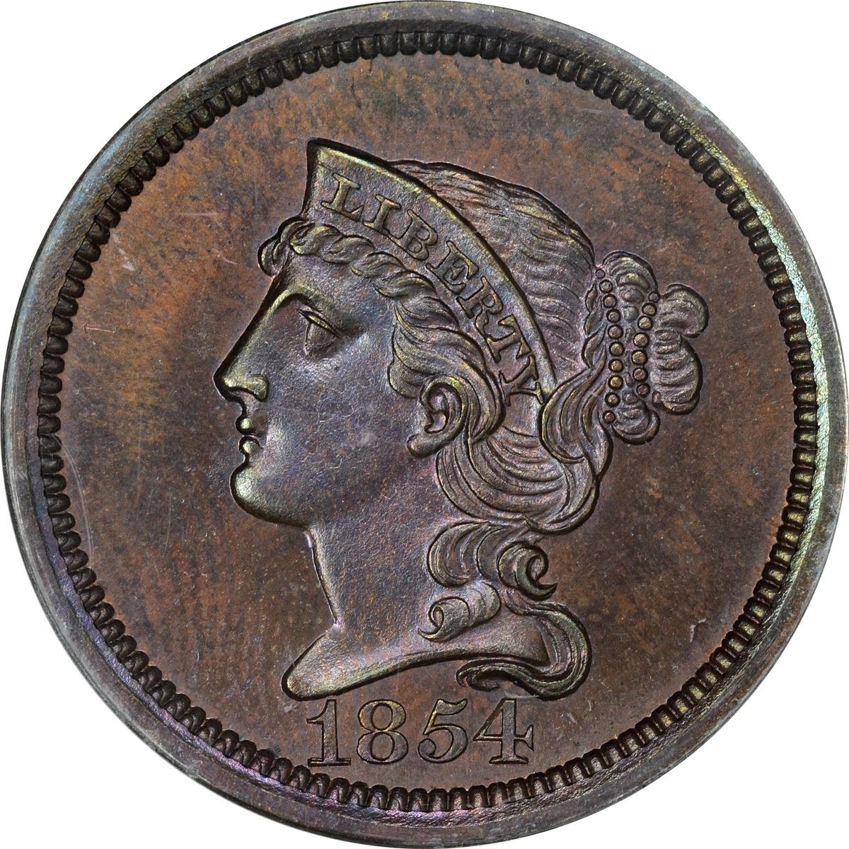This satiny golden-tan specimen is lustrous with hard and glossy surfaces that reveal attractive rose and blue highlights in a bright light source. The strike is needle-sharp on this no-stars large cent pattern, and the eye appeal is nothing shy of stupendous. Later restrikes of this issue have raised rust spots in the fields. The present piece is tied with one other example for finest certified at PCGS within any color designation. We expect that pattern specialists and large cent collectors alike will queue up for a shot at this impressive gem pattern. Housed in an old-style green label PCGS holder with frame. PCGS Population: 2; none finer within any color designation. PCGS #11664