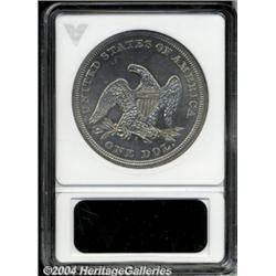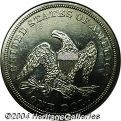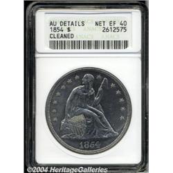 <B>1854<S$1>--Cleaned--ANACS. AU Details, Net XF40.</B></I> The 1854 Seated dollar is one of the scarcest business strikes in the series, in any condition. Although this date shows a mintage figure of 33,140, which is higher than many of its contemporaries, the 1854 has long been recognized as a rarity. One possible explanation for the scarcity of this date is that most of the pieces may have been shipped overseas to China as soon as they were made. Walter Breen noted that 10,000 silver dollars bearing this date were shipped to San Francisco in November, 1854. Whether these remained in California, or were shipped to Asia, we do not know. The current example is essentially untoned and brilliant, and exhibits wispy hairlines over each side. The design elements are sharply impressed throughout, and several light to medium abrasions are noted, mostly in the right obverse and upper reverse fields.<BR><I>From The Paulsboro Collection, Part Two.</B></I> <BR><BR><B>Important notice:</B> Heritage usually auctions material at the rate of 200-250 lots per hour. On some occasions eBay Live bid software or the Internet may not be able to keep up with the pace of the auction. We recommend placing a realistic absentee bid now as insurance to avoid disappointment. Occasionally the auctioneer may eliminate or reject an eBay Live bid, and the auctioneer may also reopen a lot after the close of the eBay live bidding (usually because we missed an audience bid), and may reject your bid even if it shows you as the winning bidder. By bidding via eBay Live, you agree that Heritage may award the lot to another bidder at its sole discretion under the circumstances described above or any other reasonable circumstances. Since eBay bids are not shown to us until we open the lot on the floor, we treat those bids just like floor bids. In most cases the floor responds before the eBay bid is presented to us, due to Internet lag time, so for consistency we have made it a policy that floor bids are always considered first over tie eBay live bids. Also please note that all Heritage lots purchased through eBay Live carry a 20% Buyer's Premium. Please make sure you read the Terms and Conditions before you bid. </span></font></tr></table></td></tr></table>