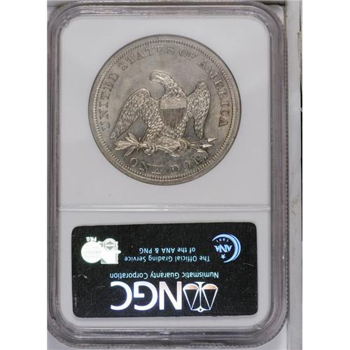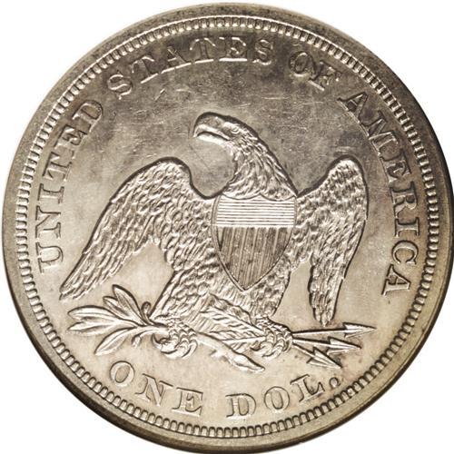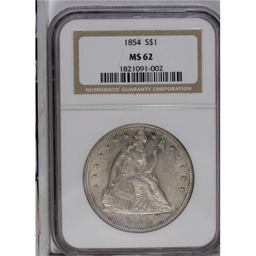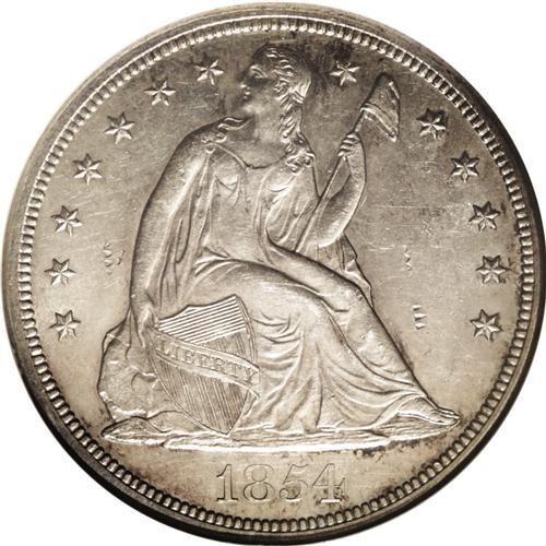 <B>1854<img border='0' src='http://www.heritagecoins.com/images/star.gif' width=10 height=10>$1> MS62 NGC.</B></I> Although this date shows a mintage figure of 33,140 pieces, that is higher than many of its contemporaries, the 1854 has long been recognized as a rarity. One explanation for the scarcity of this date is that most of them were used in quantity for trade with China. Walter Breen noted that 10,000 silver dollars bearing this date were shipped to San Francisco in November, 1854. Whether these remained in California, or were shipped to Asia, we do not know, but it is likely many went overseas. This specimen displays frosty silver-gray surfaces with whispers of light golden-tan color around the peripheries, and the design features reveal excellent delineation. A couple of milling marks are noted in the right obverse field. The luster is somewhat subdued, the primary grade-limiting factor. Census: 3 in 62, 14 finer (7/06).