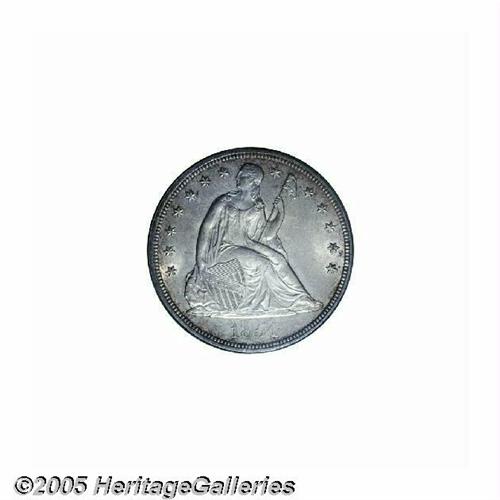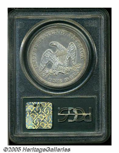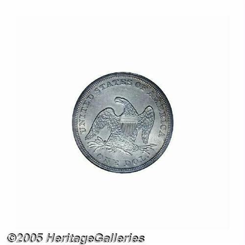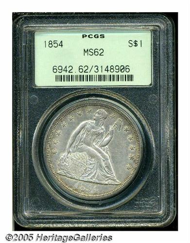 <B>1854<S$1> MS62 PCGS.</B></I> Although this date shows a mintage figure of 33,140 pieces, which is higher than many of its contemporaries, the 1854 has long been recognized as a rarity. One explanation for the scarcity of this date is that most of them were used in quantity for trade with China. Walter Breen noted that 10,000 silver dollars bearing this date were shipped to San Francisco in November, 1854. Whether these remained in California, or were shipped to Asia, we do not know, but it is likely many went overseas. This specimen displays frosty silver-gray surfaces with whispers of light golden-tan color around the peripheries, and the design features reveal excellent delineation. A couple of milling marks are noted on Liberty's neck, and another couple of rim dings appear at 4 o'clock on the reverse. Population: 2 in 62, 22 finer (6/05).<BR><I>From The Dr. John L. Pellegrini Collection of Liberty Seated Dollars.</B></I>