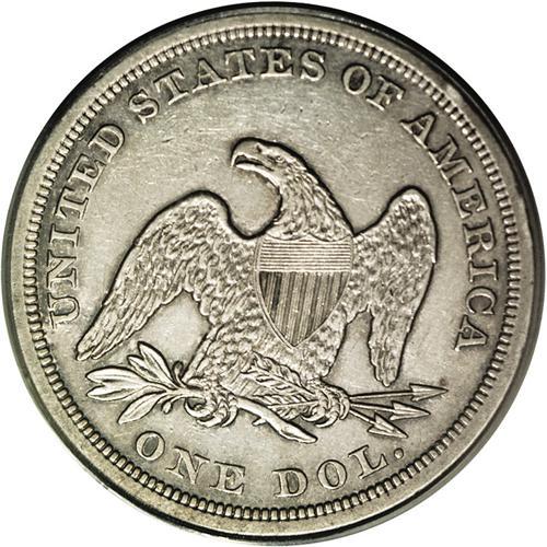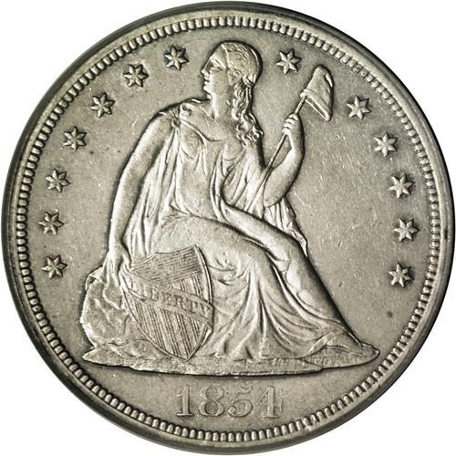 <B>1854<img border='0' src='http://www.heritagecoins.com/images/star.gif' width=10 height=10>$1> XF45 PCGS.</B></I> Light rub on each side determines the grade on this Choice XF piece, with light gray-gold surfaces to which considerable mint luster clings. This issue saw a tiny mintage of only 33,140 pieces. Population: 13 in 45, 67 finer (4/06).