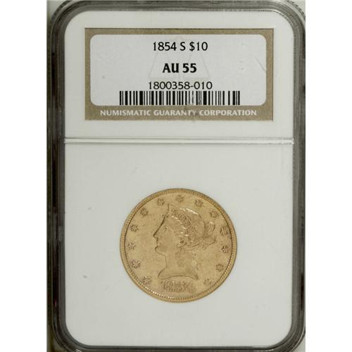 1854-S $10 AU55 NGC. The 1854-S ten dollar, with an or