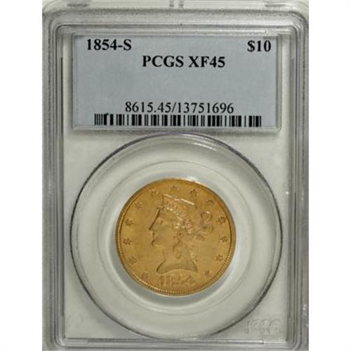 <B>1854-S $10 XF45 PCGS.</B></I> The 1854-S eagle is the first coin of this denomination struck at the San Francisco Mint. This Choice XF specimen displays attractive honey-gold patina, and traces of luster in the recesses. The design features have benefited from a sharp strike, further enhancing the coin's overall appeal. We note a couple of inoffensive milling marks on Liberty's neck.<BR><BR><B>Coin Engraver:</B> Christian Gobrecht<BR><BR><b>Shipping:</b> Coins & Currency (<a target="_blank" href="http://www.heritageauctions.com/common/shipping.php">view shipping information</a>)