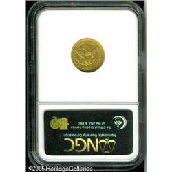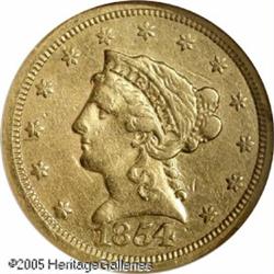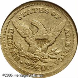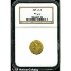 <B>1854-S $2 1/2 VF25 NGC.</B></I> The 1854-S is a historic and important rarity of the first order and a numismatic classic with few peers in terms of absolute rarity and prestige. In the past decade, there have only been five public offerings of this issue, a level of availability that is frankly higher than one would expect with so few known. It is one of the rarest of all gold coins ever issued, with a meager mintage of 246 pieces. Apparently in 1854 the new San Francisco Mint was desperately lacking the parting acids which were used to purify gold bullion. This was quite a problem as most of the native California gold contained impurities that had to be removed to bring the gold up to the standard of .900 fineness, with the balance of the remaining 10% being a mix of copper primarily and silver. These secondary metals greatly increased the strength of the gold planchets. Long reported as 12-15 known, this number may be too high according to the census listed below.<BR><BR> 1. Finest Known, PCGS AU-50 The Bass Coin. Ex: F.C.C. Boyd, "World's Greatest Collection;" J. F. Bell Collection (Jacob F. Shapiro, Stack's 12/44); Memorable (J. F. Shapiro, Numismatic Galley 3/48); Adolphe Menjou (Numismatic Galleries, 6/50) lot 1326; New Netherlands # 51 (6/58), lot 837 (not part of the Rio Rancho Sale Superior 10/74 as previously reported, see below) Harry Bass privately in 1974; Harry Bass, Jr. Collection (Bowers and Merena, 10/99) lot 472; Superior Elite Sale 1/2004, lot 792 identifiable by a short scratch from the top arrow to the right serif of M.<BR> 2. NGC VF35, Ex: Davis-Graves (Stack's, 4/54) lot 826; Rio Rancho (Superior, 10/74); lot 89; Richmond I (David Lawrence Rare Coins, 7/2004) lot 1149 at $86,250. Identifiable by a nick below star 7, and a small dark area above the T of UNITED in the dentils.<BR> 3. XF40 Cleaned and Planchet Flaws. Ex: William Cutler Atwater (B. Max Mehl, 6/46); Grant Pierce (Stack's, 5/65), lot 1154; Miles (Stack's, 10/68), lot 166; 1973 ANA Sale (Jess Peters, 8/73), lot 826; 1974 MANA Sale lot 1547; Arthur Lamborn "Fairfield" (Bowers and Ruddy, 10/77), lot 1544; Long Beach Sale (Heritage, 10/95), lot 5527. Identifiable by roughness on the upper left obverse, lower left reverse and a nick over star 13.<BR> 4. NGC VF25, the present example. Nick below the 54 of date, scratch in lower left obverse field. Possibly one of those below.<BR> 5. Fine/Very Good reverse Samuel W. Wolfson Sale (Stack's, 10/62), lot 165. Moderate wear, no identifying marks seen on the plate, possibly one of those listed below.<BR> 6. Fine/VG reverse. Gilhousen (Superior, 2/73), lot 184 and Rio Rancho (Superior, 10/74), lot 90, identifiable by a rough area on the left central obverse.<BR> 7. Very Good. Ex: Auction '81 (Paramount, 8/81), lot 1405; Stack's 5/00, lot 1194. Identifiable by a few rim ticks, one between the first two stars, another at the base of the reverse.<BR> 8. Very Good/Good. Ex: Elmer Sears, 8/1915; John H. Clapp; Louis Eliasberg (Bowers and Ruddy, 10/82), lot 170. Identifiable by wear and no real surface problems.<BR> 9. Very Good/Fine. Ex: Kreisberg / Schulman Sale 2/60, lot 2592 and ANA Sale (New England Rare Coin Galleries, 8/79), lot 82.<BR> 10. Obverse VF, Scratched, Shank Removed affecting NITE and AMER on the reverse.<BR> 11. Another Ex: Jewelry piece, listed as "loop removed, traces of solder, Texas private collection."<BR><BR> This particular coin shows slightly more detail on the obverse than the reverse. Green-gold color overall, the surfaces show several distinguishing marks. On the obverse, a very thin, jagged scratch runs from below star 3 to just below the chin of Liberty, a shallow planchet flaw is seen to the left of the top of the 1 in the date, another long, shallow depression is located above the bun of Liberty's hair, and a couple of marks are just behind Liberty's neck. On the reverse, an angling scratch is seen from the top left of the U in UNITED to the denticles, and a minor scratch is seen below and another above the eagle's right (facing) wing.<BR><I>Purchased from Abner Kreisberg Corporation on November 9, 1982 for $24,000.</B></I><BR><I>From The Beverly Hills Collection.</B></I> Lot:7584