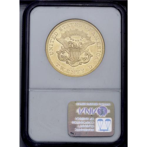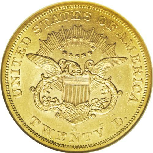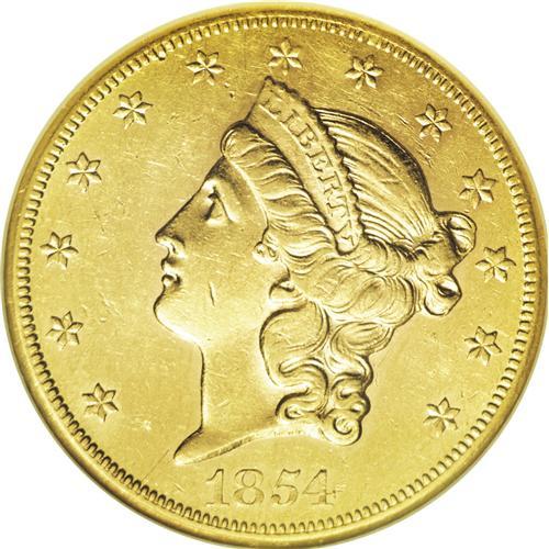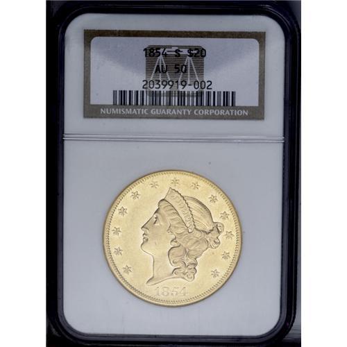 <B>1854-S<$20> AU50 NGC.</B></I> There is little doubt that this example, like all double eagles coined in San Francisco once the branch Mint opened, is coined from gold mined in California. Today, examples exist from four primary sources: those that happened to survive over a century and a half from the time they were minted, others discovered as part of treasure found from the wreak of the <I>S.S. Yankee Blade,</B></I> and similar treasure coins from the <I>S.S. Central America</B></I> and the <I>S.S. Republic.</B></I><BR> This attractive AU example is a splendid representative. The surfaces have bright yellow-gold luster with hints of green, and with traces of rose toning. Both sides have satiny surfaces with hints of reflectivity. The importance of this issue is obviously its historical significance; a collectible representative of the San Francisco Mint's debut.<BR><I>From The Wyoming Collection.</B></I>