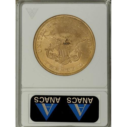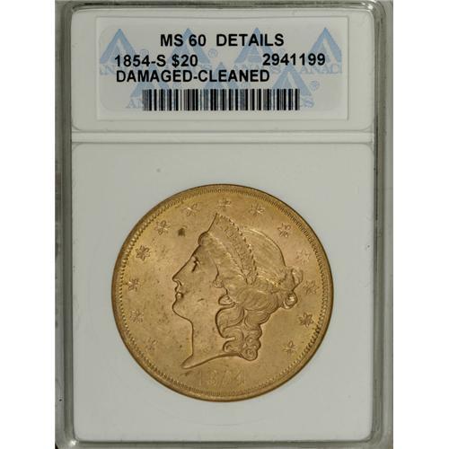 1854-S $20 --Damaged, Cleaned--ANACS. MS60 Details. A h