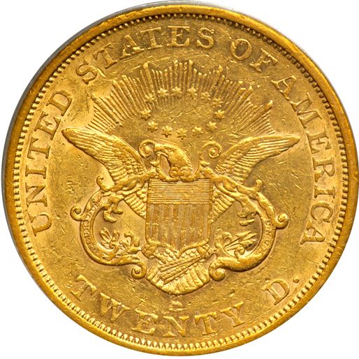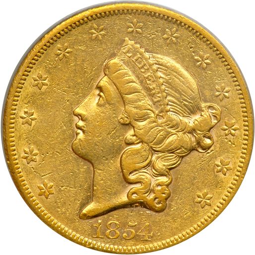 1854-S $20 Liberty. PCGS graded EF-45. Lovely golden toning. Another well-struck example. The San Francisco Mint was opened in 1854 to serve the gold mines of the California Gold Rush. It quickly outgrew its first building and moved into a new one in 1874. The Old United States Mint, also known affectionately as The Granite Lady, is one of the few that survived the great 1906 San Francisco earthquake. It served until 1937, when the present facility was opened. It is located at 88 Fifth St., San Francisco. Within the first year of its operation, the San Francisco mint turned $4 million in gold bullion into coins (PCGS # 8913) .