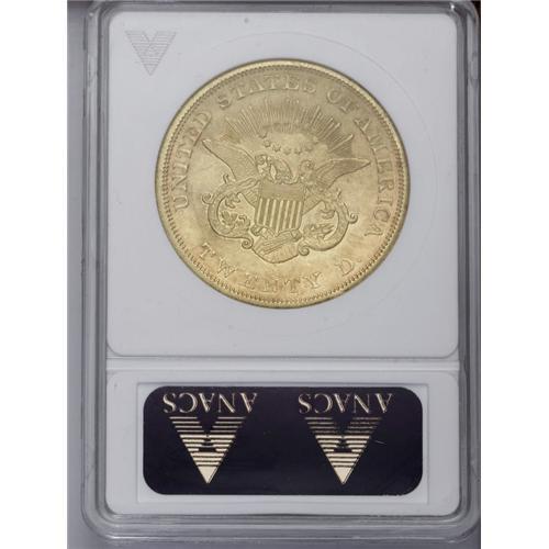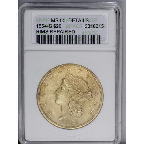 <B>1854-S $20 --Rims Repaired--ANACS. MS60 Details.</B></I> A subtle obverse rim repair is noted at 9 o'clock. The minutely granular greenish-gold surfaces exhibit subtle, unbroken cartwheel shimmer. A pinscratch is seen between stars 12 and 13, but the reverse is remarkably unabraded.