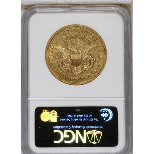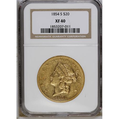 <B>1854-S $20 XF40 NGC.</B></I> The reverse retains peripheral luster on this straw-gold example, coined in the first year of the San Francisco Mint. Softly struck with numerous handling marks and several moderate abrasions on the obverse.<BR><BR><b>Shipping:</b> Coin/Currency (<a target="_blank" href="http://www.heritageauctions.com/common/shipping.php">view shipping information</a>)