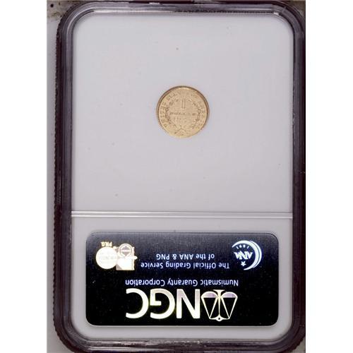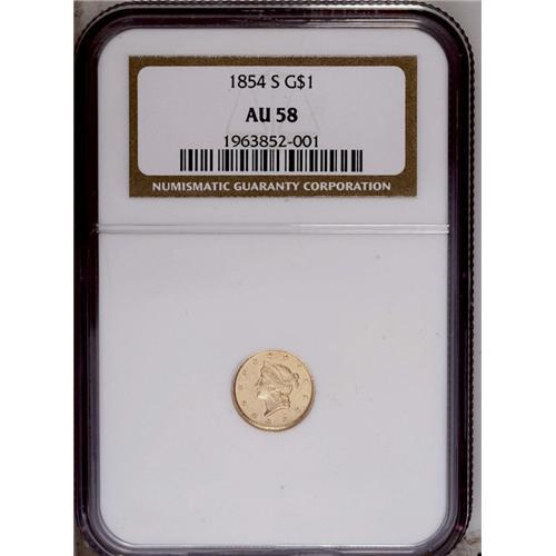 <B>1854-S<G$1> AU58 NGC.</B></I> Here is a partially lustrous specimen from the first year of San Francisco Mint operations, and one of just seven dates in the gold dollar series, 1849-1889, to emanate from that facility. This satiny piece is nicely struck and exhibits a slightly muted, straw-gold color on both sides.