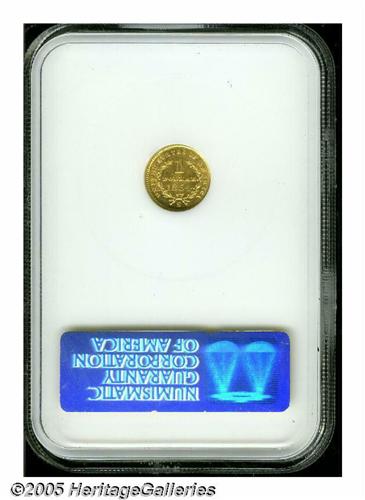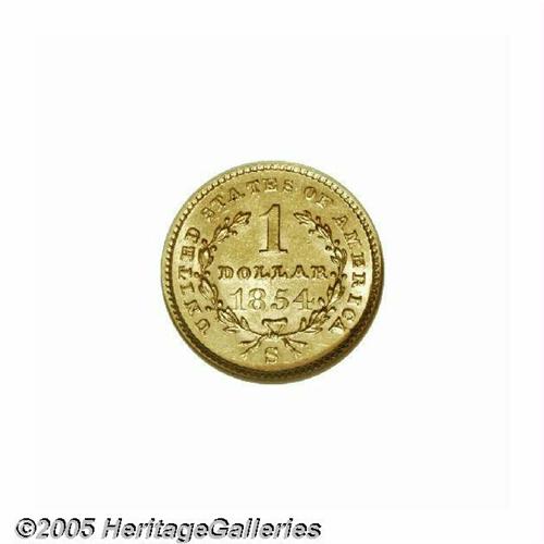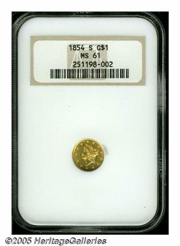 <B>1854-S<G$1> MS61 NGC.</B></I> This is one of the most important Gold Dollars in the present sale for several reasons: it is a representative of the first year of operation at the San Francisco Mint, it is a low-mintage issue (14,632) with few survivors in Mint State, and it is the only San Francisco Gold Dollar with the Liberty Head design. Sharply struck and fully lustrous with brilliant and slightly reflective yellow-gold surfaces. Lightly abraded as expected for the grade, but with few heavy marks. This is a lovely example for the grade, and highly desirable for the reasons discussed above.<BR><I>From The Stig Ericsson Collection.</B></I>