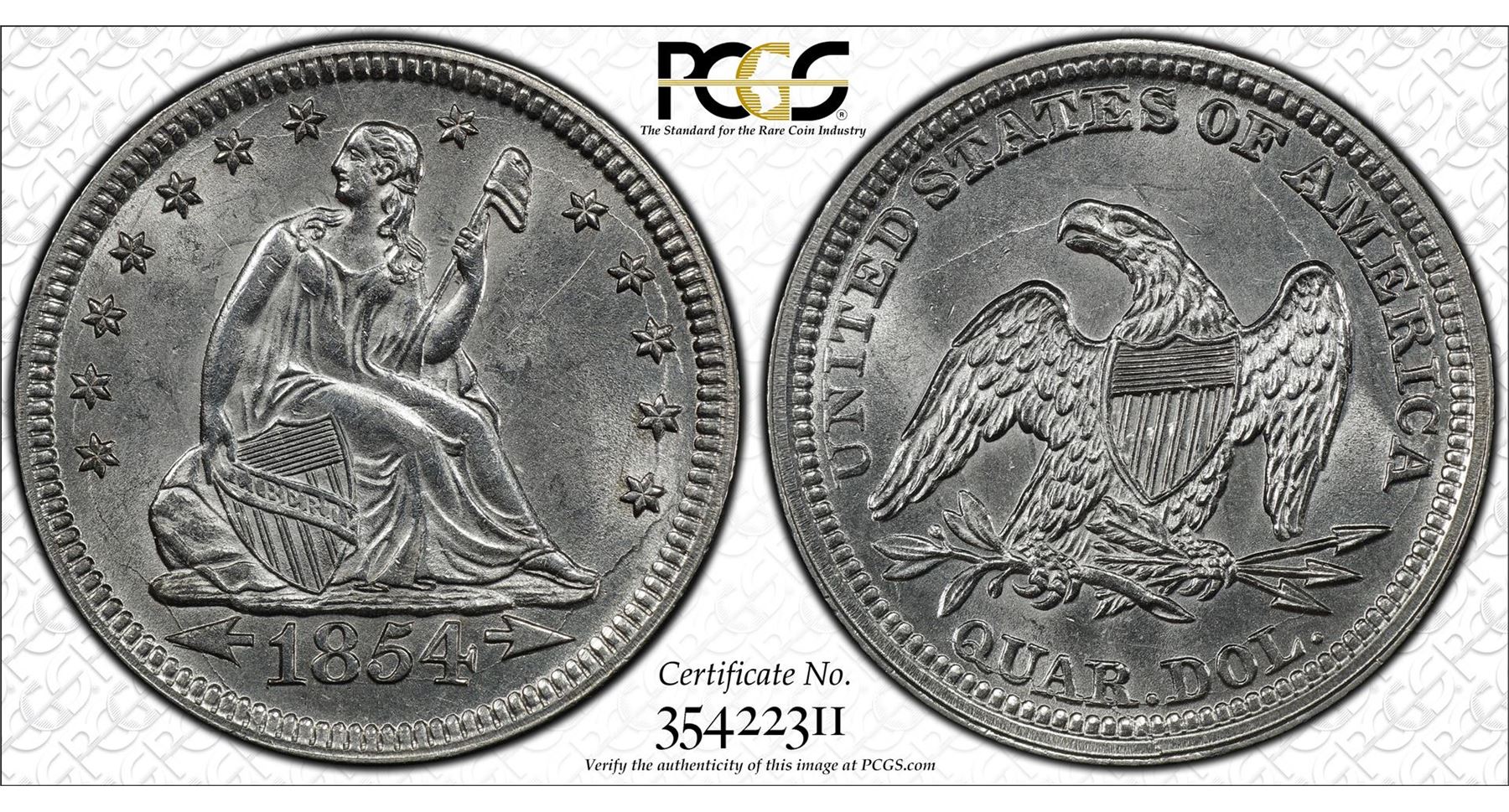 One 1854 Seated Liberty Quarter Coin PCGS MS62 Arrows. PCGS Graded.