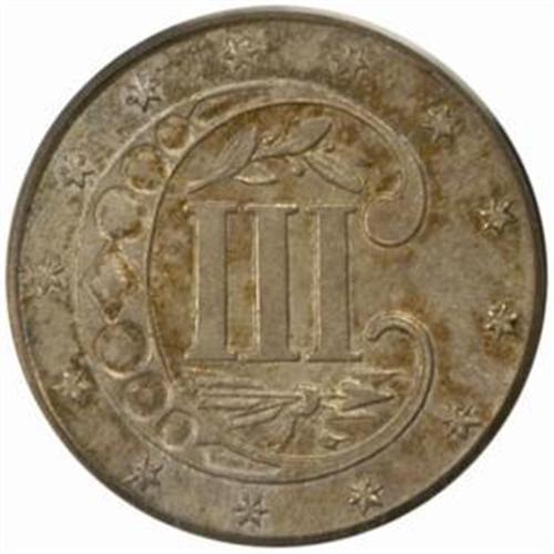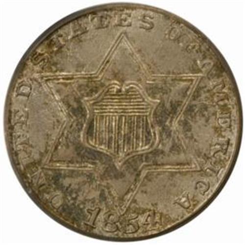 <style type="text/css"> body, td, th { font-family: Arial, Helvetica, sans-serif; font-size: 12px; color: #482424; margin: 0px; padding: 0px; } #header { background-image: url(http://www.bowersandmerena.com/ebay/images/template_v3_01.gif); clear: both; background-color: #590303; border-top-width: 2px; border-top-style: solid; border-top-color: #B38C4F;}#header #header_wrapper { height: 75px; clear: both; width: 800px; margin-right: auto; margin-left: auto; background-image: url(http://www.bowersandmerena.com/ebay/images/template_v3_03.gif); background-repeat: no-repeat; background-position: right; color: #F3EDCC;}#header #header_wrapper #header_logo { float: left; height: 75px; width: 444px; background-image: url(http://www.bowersandmerena.com/ebay/images/template_v3_02.gif); background-repeat: no-repeat; font-size: 10px; text-transform: capitalize; color: #B38C4F;}#header #header_wrapper #header_right { float: left; height: 75px; width: 356px; text-align: right;}#header #header_wrapper #header_right #headerLoginBtn { margin-bottom: 30px;}#header #header_wrapper #header_right input#txtSearch { color: #B49056; border: 1px solid #B49056; width: 175px; padding-top: 3px; padding-right: 3px; padding-bottom: 4px; padding-left: 3px;}#nav { height: 37px; background-image: url(http://www.bowersandmerena.com/ebay/images/template_v3_05.gif); clear: both;}#nav #nav_wrapper { height: 35px; width: 800px; margin-right: auto; margin-left: auto; border-left-width: 1px; border-left-style: solid; border-left-color: #B38C4F;}#nav #nav_wrapper a { padding-right: 15px; padding-left: 15px; border-right-width: 1px; border-right-style: solid; border-right-color: #B38C4F; height: 25px; padding-top: 10px; display: block; float: left; text-decoration: none; font-weight: bold; color: #5D0303;}#nav #nav_wrapper a:hover { color: #B38C4F;}#nav #nav_wrapper #search { float: right; padding-top: 7px;}#nav #nav_wrapper #search #txtSearch { font-family: Arial, Helvetica, sans-serif; font-size: 10px; text-transform: uppercase; color: #D2AE75; border: 1px solid #B38C4F; padding: 3px;}#content_bgd { background-image: url(http://www.bowersandmerena.com/ebay/images/template_v3_09.gif); background-repeat: repeat-y; background-position: center; padding-top: 15px; padding-bottom: 15px; background-color: #FBFBDB;}#content_wrapper { clear: both; height: auto; width: 800px; margin-right: auto; margin-left: auto;}.LotDetailWhite{ line-height:normal; font-size:13px; font-family: arial,helvetica,sans-serif; color: White; font-weight: bold;}.LotDetailInformation{ line-height:normal; font-size: 13px; font-family: arial,helvetica,sans-serif;}.LotDetailMessage{ line-height:normal; font-size: 13px; font-family: arial,helvetica,sans-serif; color: red;}}tr.HeaderAuctionTitle td { color: #000000; font-weight: bold; padding: 2px; background-image: url(http://www.bowersandmerena.com/ebay/images/template_v3_05.gif); background-repeat: repeat-x; border-bottom-width: 1px; border-bottom-style: solid; border-bottom-color: #B38C4F;}table.AuctionSummary a, table.AuctionSummary a:link, table.AuctionSummary a:visited { color: #0000FF; text-decoration: none;}}td.tableHeaderLeft { border-left-width: 1px; border-left-style: solid; border-left-color: #B38C4F;}td.tableHeaderRight { border-right-width: 1px; border-right-style: solid; border-right-color: #B38C4F;}td.tableCellMiddle { border-left-width: 1px; border-left-style: solid; border-left-color: #B38C4F; border-right-width: 1px; border-right-style: solid; border-right-color: #B38C4F; padding: 5px;}tr.footer td { border-top-width: 1px; border-top-style: solid; border-top-color: #B38C4F;}</style></head><body><div id="header"> <div id="header_wrapper"> <div id="header_logo"> </div> <div id="header_right"> </div> </div></div><div id="nav"> <div id="nav_wrapper"> <a href="http://www.bowersandmerena.com">Our eBayLive Auctions</a> <a href="#PaymentInfo">Payment Information</a> <a href="#ShippingInfo">Shipping Information</a> <a href="#About">About Bowers and Merena</a> </div></div><div id="content_bgd"> <div id="content_wrapper"> <table width="100%" border="0" cellpadding="5" cellspacing="0" class="AuctionSummary"> <tbody> <tr class="HeaderAuctionTitle" style="height: 25px;"> <td align="left" class="tableHeaderLeft" > </td> <td align="center" class="tableHeaderRight"> <span style="font-size: large;">Lot #343. 1854 Silver Three-Cent Piece. MS-64 (PCGS).</span> </td> </tr> <tr> <td colspan="3" class="tableCellMiddle"> An important high-grade representative of the conditionally challenging Type II Trime, this Choice 1854 is originally toned in a base of silver-lavender patina. The surfaces are also splashed with mottled olive, copper and powder-blue iridescence that further confirms the coin's originality. Sharply struck and satiny, with no outwardly distracting abrasions.