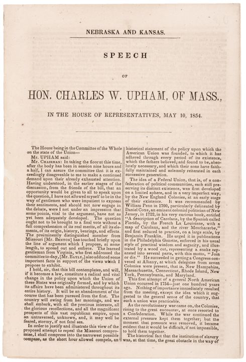 May 10, 1854, Speech: “NEBRASKA AND KANSAS,” Regarding Statehood and Slavery Issues, by Charles W. Upham of Mass., Very Fine.