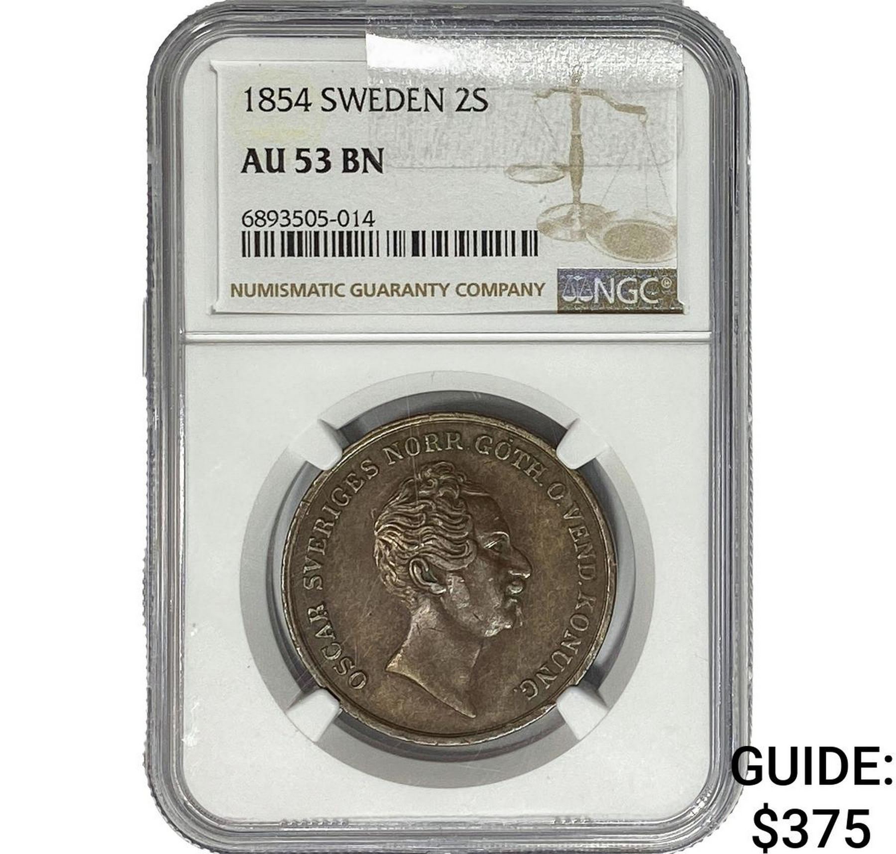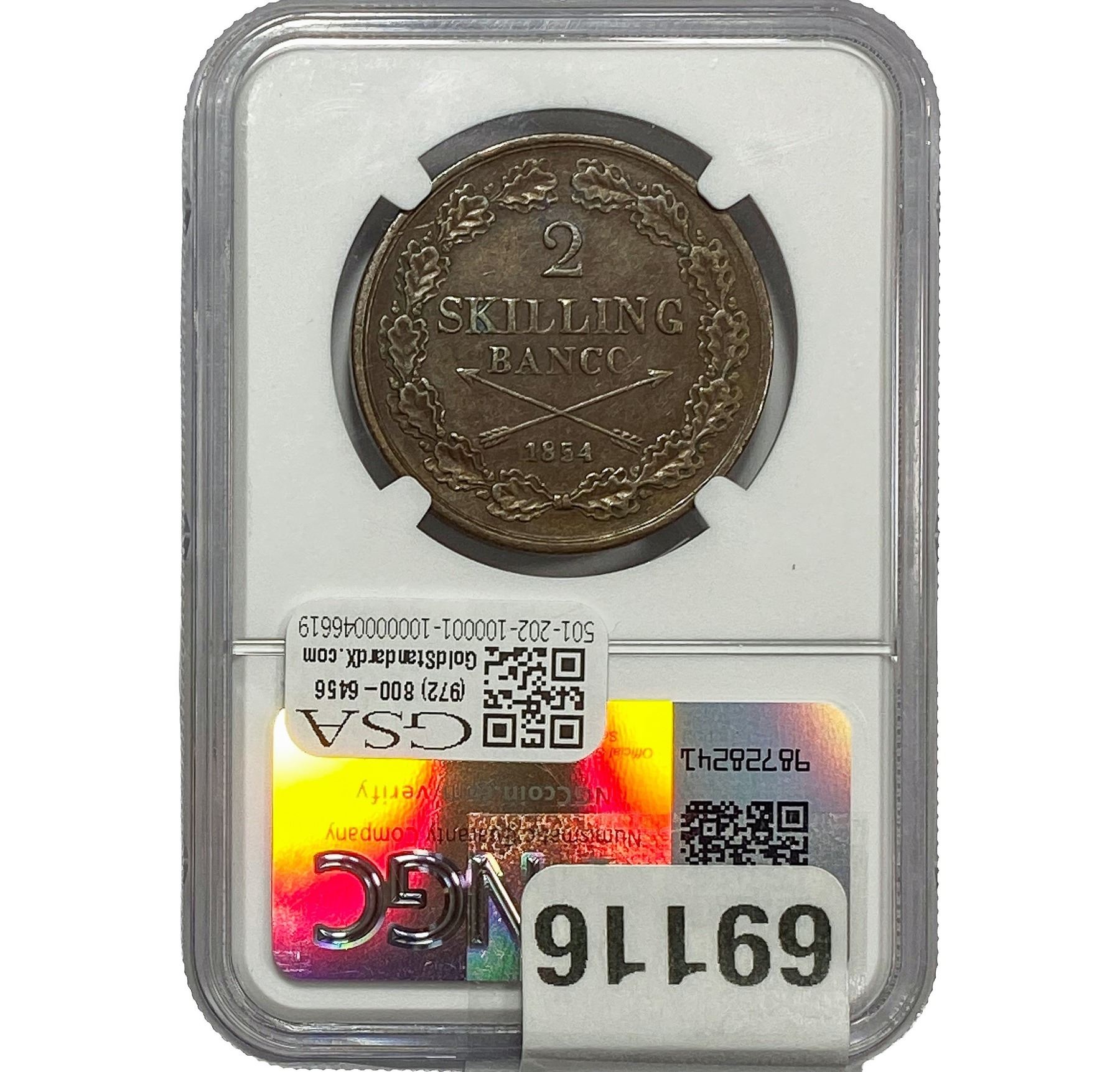 1854 Sweden 2 Skilling NGC AU53 BRN
