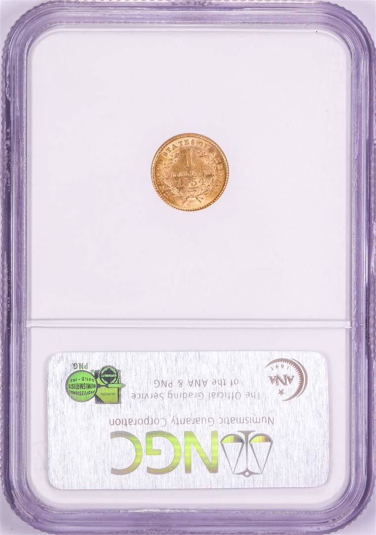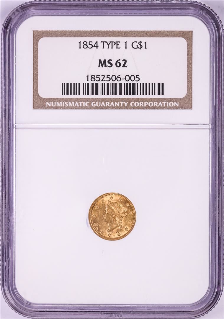 One 1854 Type 1 $1 Liberty Head Gold Dollar Coin NGC MS62. NGC Certified.