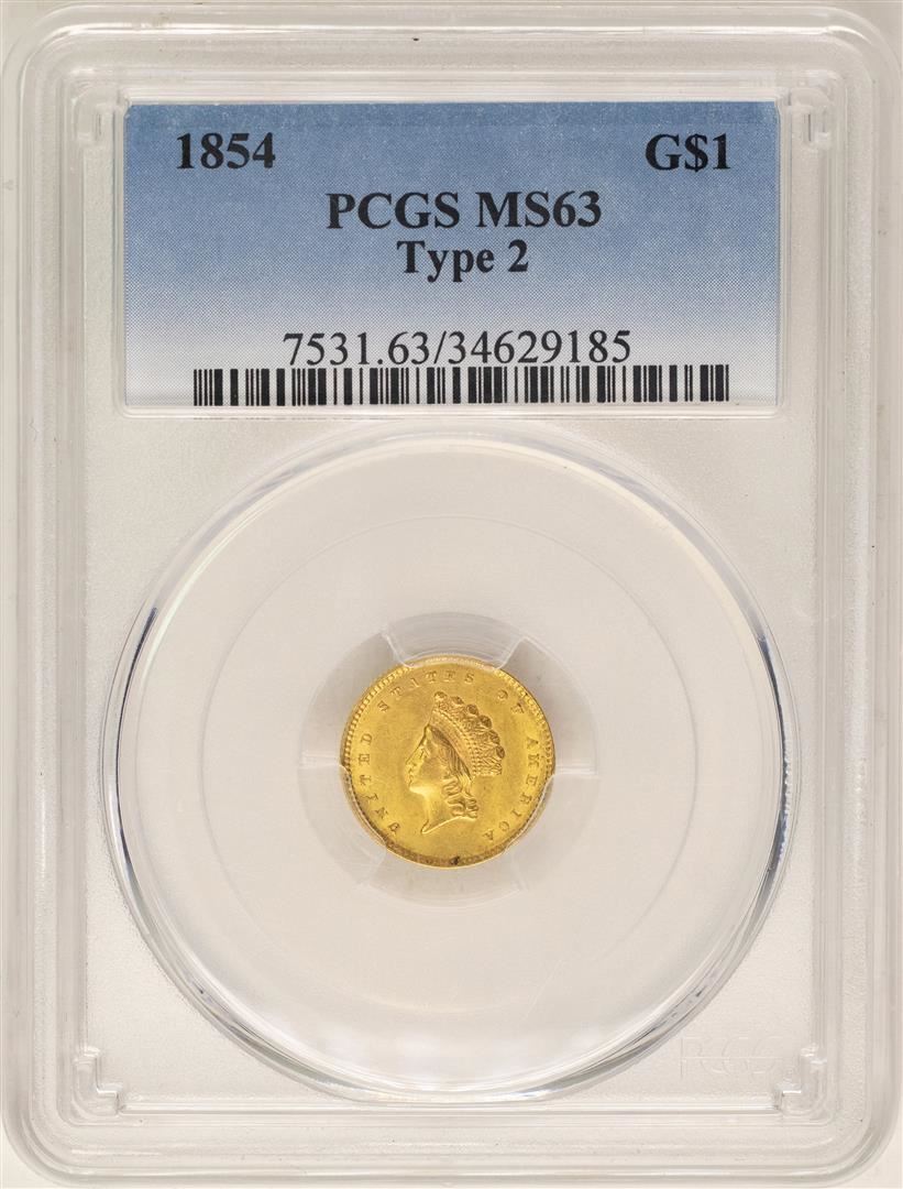 One 1854 Type 2 $1 Indian Princess Head Gold Dollar Coin PCGS MS63. PCGS Graded.