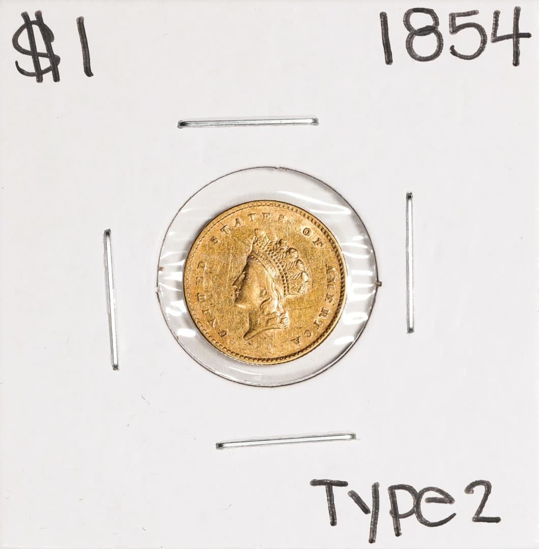 One 1854 Type 2 $1 Indian Princess Head Gold Dollar Coin.