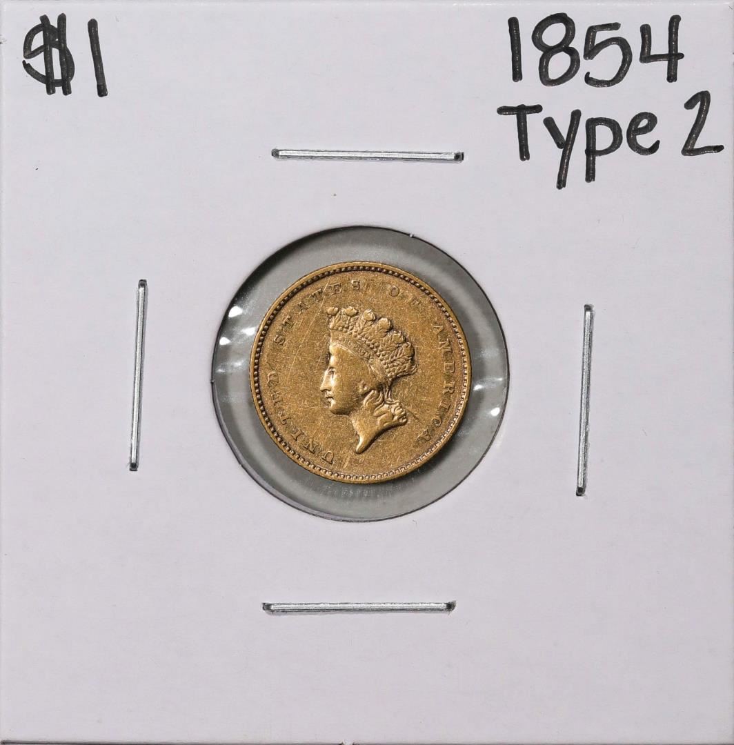 One 1854 Type 2 $1 Indian Princess Head Gold Dollar Coin.