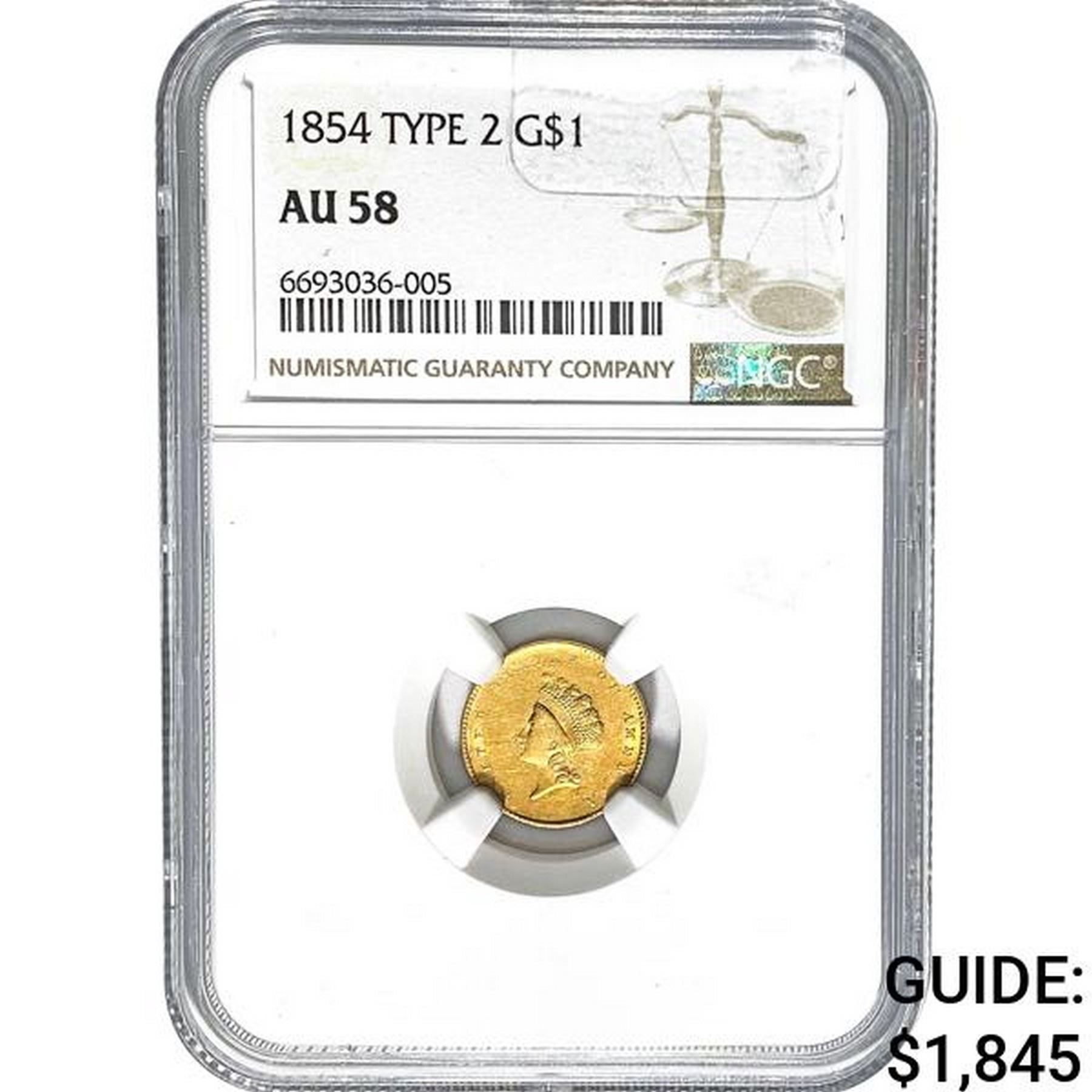 1854 Type 2 Gold Dollar NGC AU58