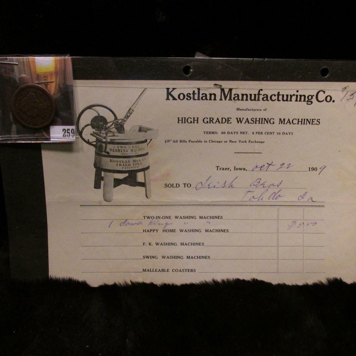 1854 U.S. Large Cent, Fine; & 1909 Invoice from "Kostlan Manufacturing Co. Manufacturers of High Grade Washing Machines…Traer, Iowa"