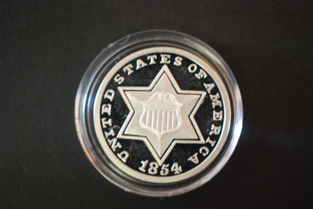 1854 US Three Cent Nickel REPLICA Silver Round; .999 Fine Silver .385 Oz.; EST. $15-20