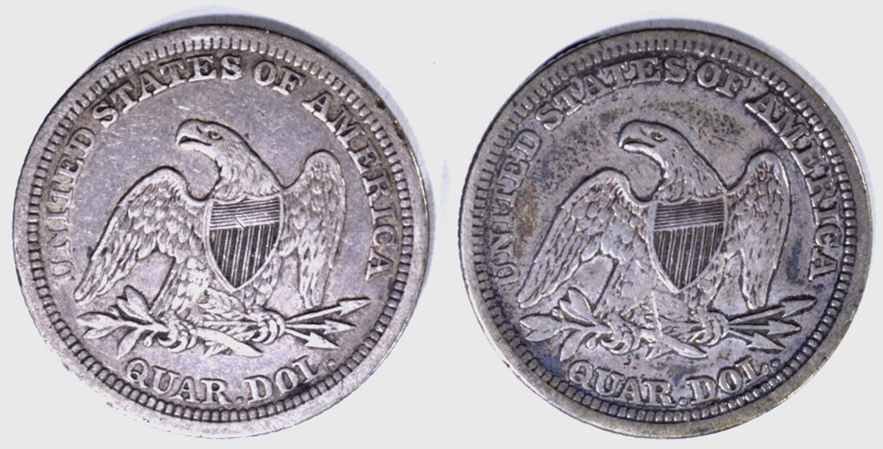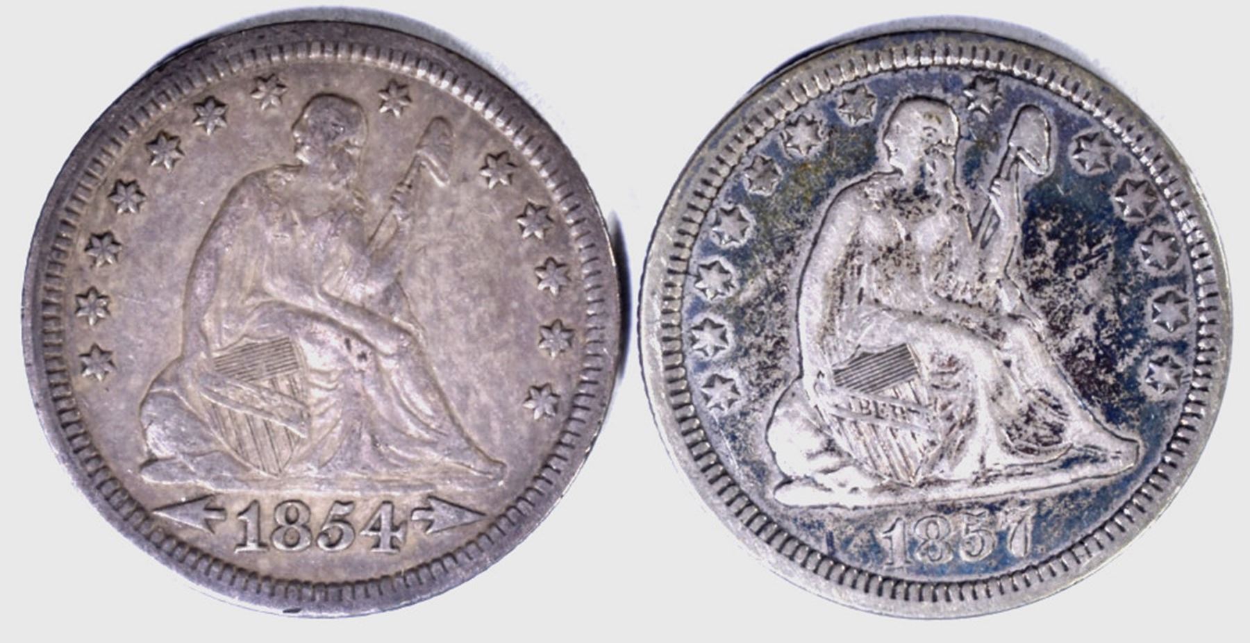 1854 WITH ARROWS & 1857 SEATED QUARTERS, XF