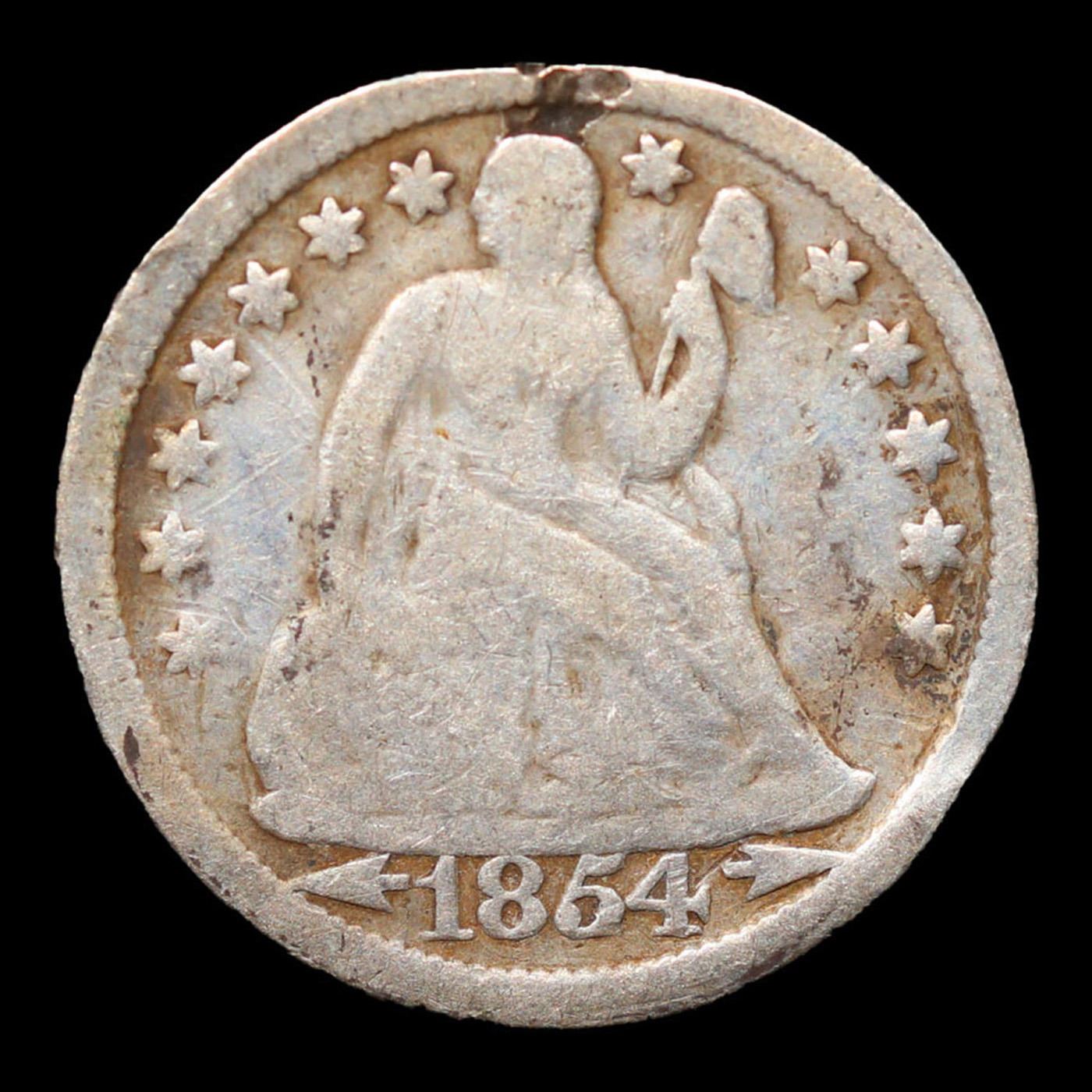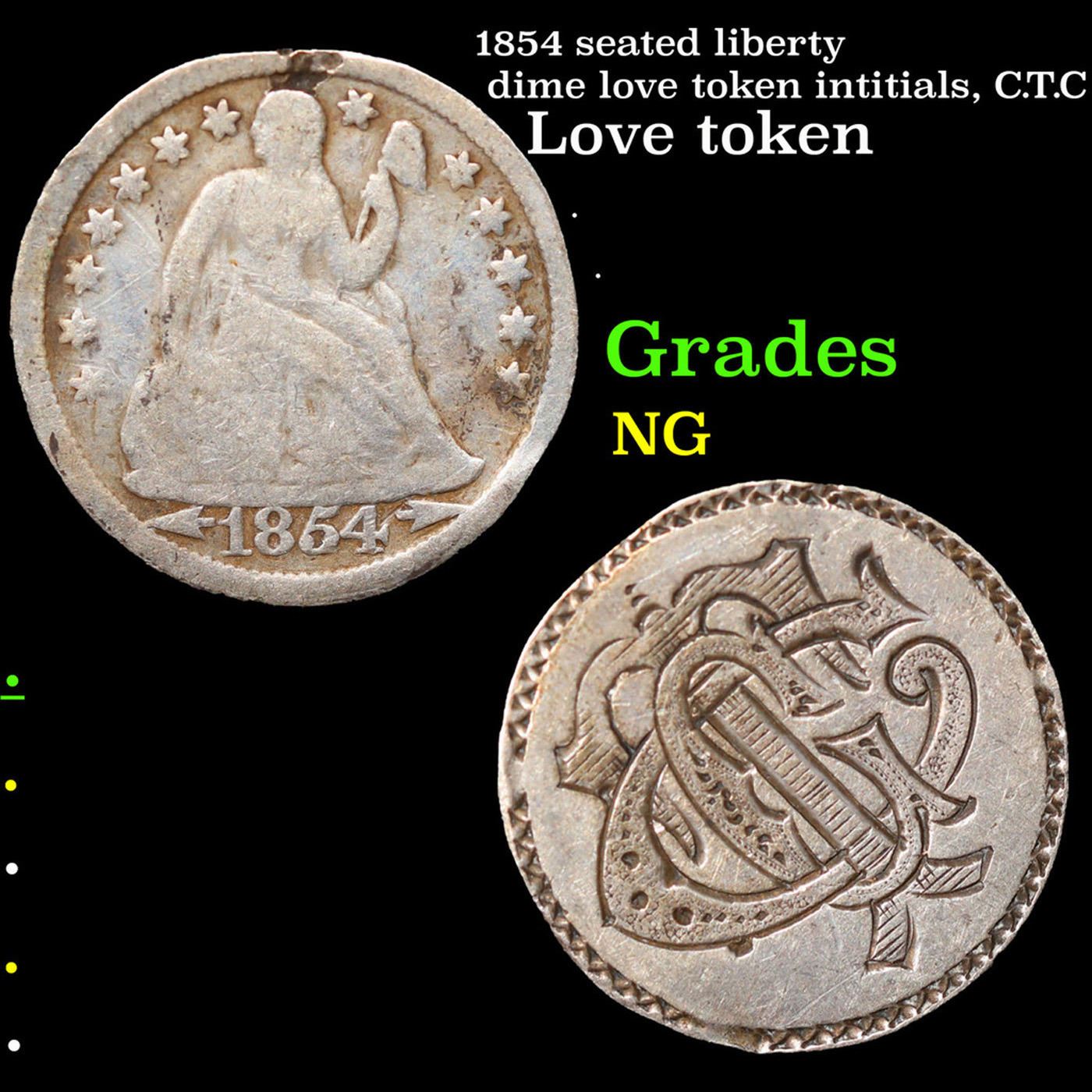 1854 seated liberty dime love token intitials, C.T.C Grades NG. Love tokens are coins that were engraved after the minting process was complete. Generally, an artisan removed the words and images from the reverse, or sometimes from both the obverse and the reverse of a coin. Artisans ranging in skills from a high-quality craftsperson to a "do-it-yourselfer" then engraved or punched pictures, initials, and messages on the cleared area.Other times, the coin was left intact and the artisan engraved initials, dates, or pictures on the edges around the images of liberty or royalty. The coins became lucky charms, objects of art, and pieces of jewelry. The messages on the coins could be used as spiritual reminders, family documentation, or sentimental sweet nothings.It is believed that the love token originated in Great Britain as early as the 13th century with the practice of bending coins. When dealing with your favorite saint, in return for a favor, a coin was bent and a pledge was made. The bent coin, "a token of your pledge," became a physical reminder of your obligation.