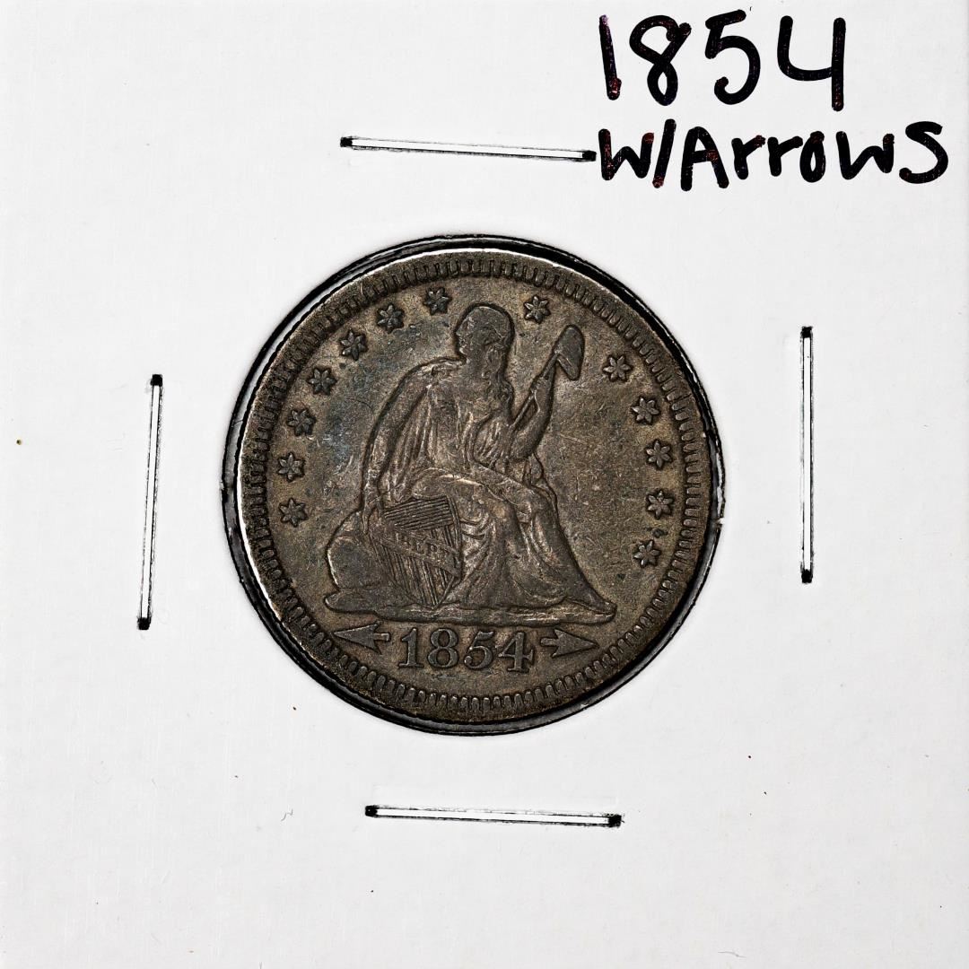 One 1854 w/Arrow Seated Liberty Quarter Coin.