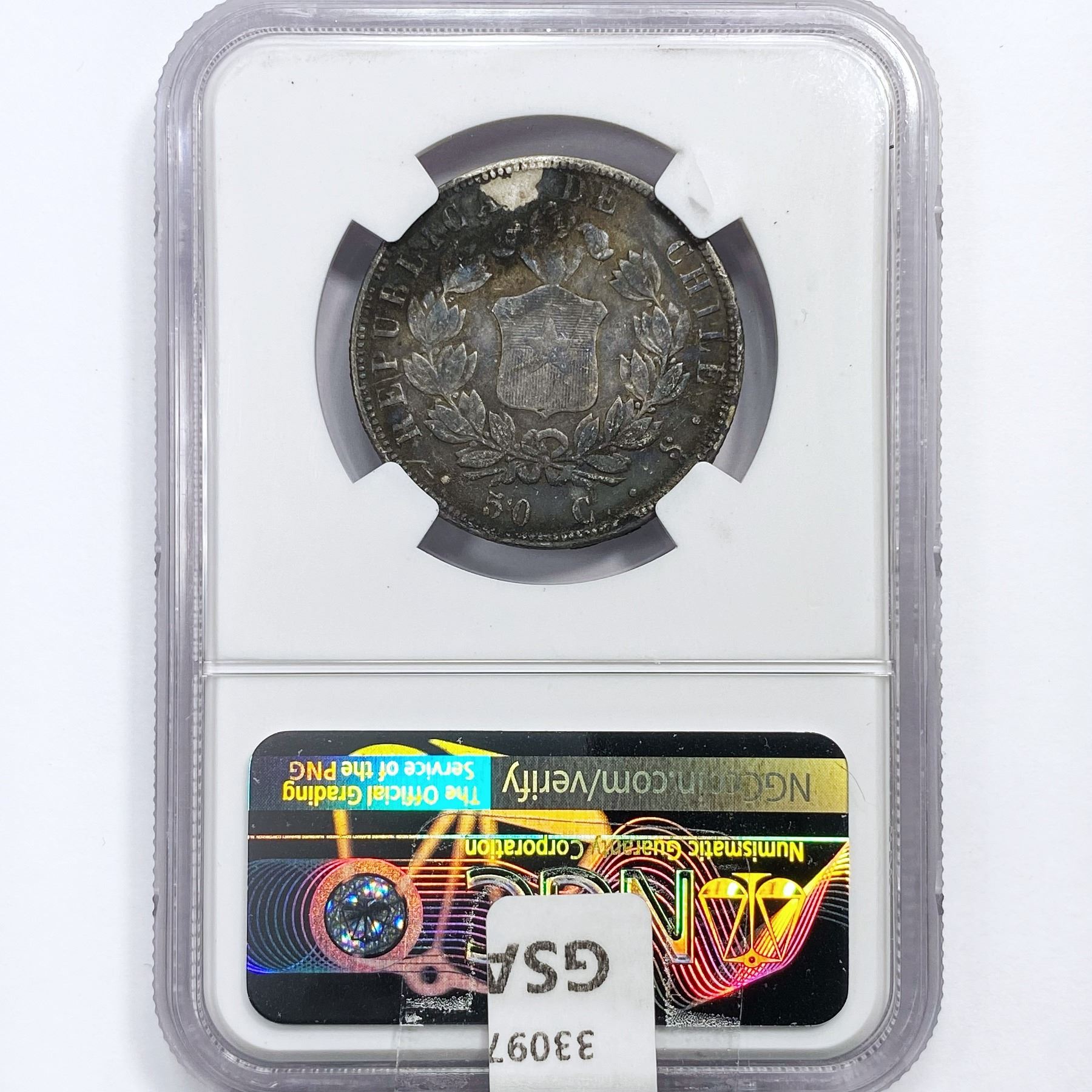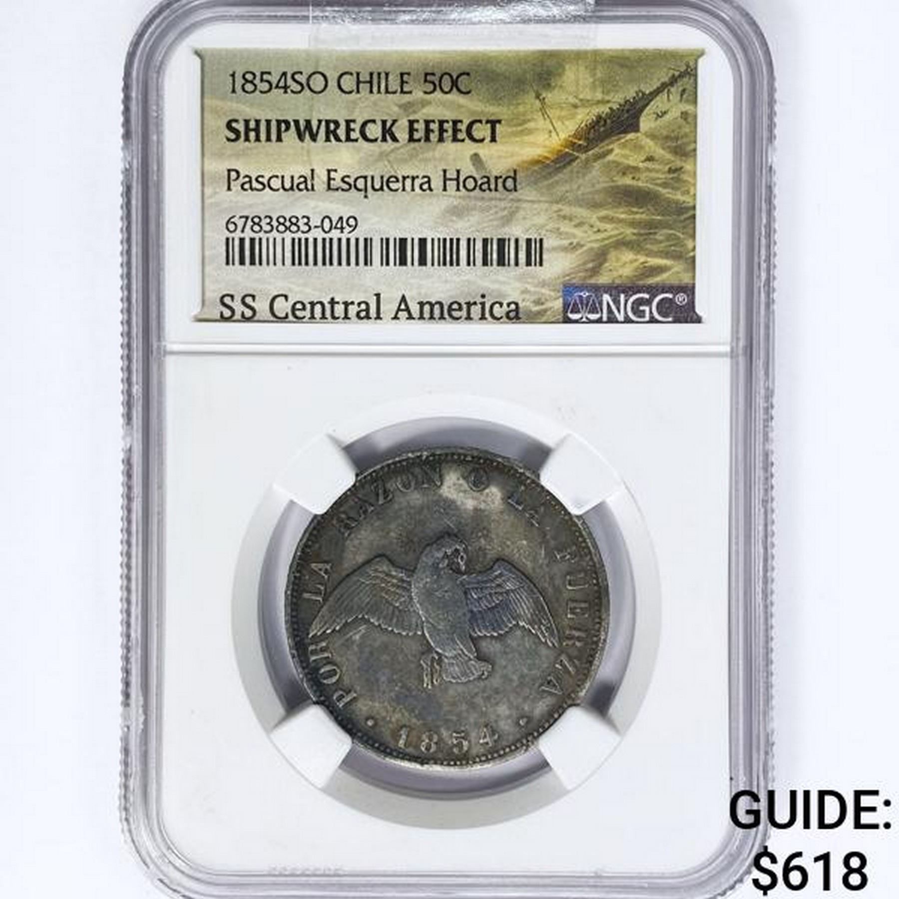 1854SO 50C Chile NGC Shipwreck SS Central America NGC certified S.S. Central American 1853 Chile 50c, shipwreck effect, From the Pascual Esquerra shipment contained in the Gold Room, which constituted a "hoard" of Chilean silver coins. Pascual Esquerra was a Chilean and Spanish businessman, listing his hometowns as Valparaiso, Chile, and Zaragoza, Spain. In Panama he met up with a group that had sailed together from Callao, Peru. Jose Seguin, the Peruvian Minister to the United States, along with his Secretary, Nicolas Tirado. The group included Ange Richon, the Belgian Consul at Lima, Peru, who was carrying diplomatic dispatches to Paris. The silver coins found on the SSCA, especially the bulk shipment of Chilean silver coin, were not part of the Award that split the gold between the Columbus Discovery group and the surviving insurance companies. The Chilean coin was part of a shipment of silver by a specific passenger. It was, by its very nature, still considered "specie", and would have acted as money anywhere in the United States. Esquerra was shipping the Chilean silver, all held in the gold room under the control of Purser Hull.