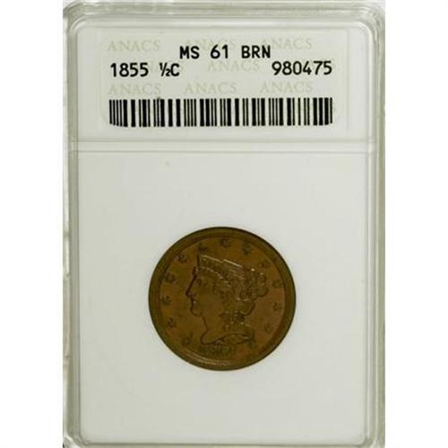 <B>1855 1/2 C MS61 Brown ANACS.</B></I> NGC Census: (28/390). PCGS Population (6/285). Mintage: 56,500. Numismedia Wsl. Price for NGC/PCGS coin in MS61: $183. (#1233)<BR><BR><B>Coin Engraver:</B> Christian Gobrecht<BR><BR><b>Shipping:</b> Coins & Currency (<a target="_blank" href="http://www.heritageauctions.com/common/shipping.php">view shipping information</a>)