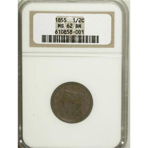 <B>1855 1/2 C MS62 Brown NGC.</B></I> PCGS Population (50/236). NGC Census: (69/324). Mintage: 56,500. Numismedia Wsl. Price for NGC/PCGS coin in MS62: $192. (#1233)<BR><BR><B>Coin Engraver:</B> Christian Gobrecht<BR><BR><b>Shipping:</b> Coins & Currency (<a target="_blank" href="http://www.heritageauctions.com/common/shipping.php">view shipping information</a>)