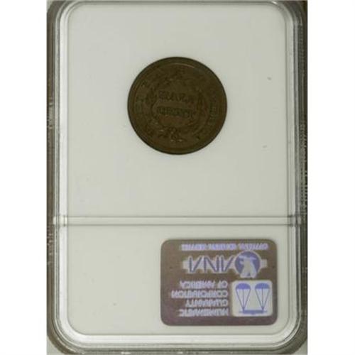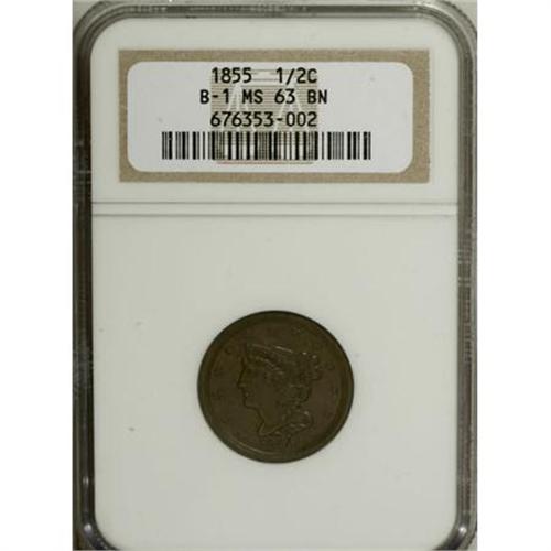 <B>1855 1/2 C MS63 Brown NGC.</B></I> B-1. NGC Census: (85/235). PCGS Population (109/123). Mintage: 56,500. Numismedia Wsl. Price for NGC/PCGS coin in MS63: $267. (#1233)<BR><BR><B>Coin Engraver:</B> Christian Gobrecht<BR><BR><b>Shipping:</b> Coins & Currency (<a target="_blank" href="http://www.heritageauctions.com/common/shipping.php">view shipping information</a>\)