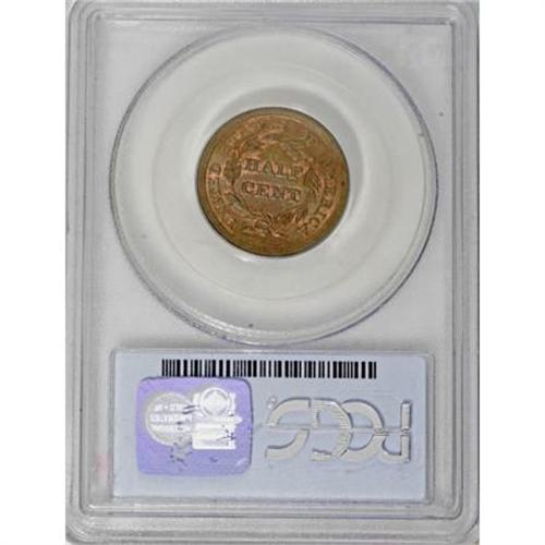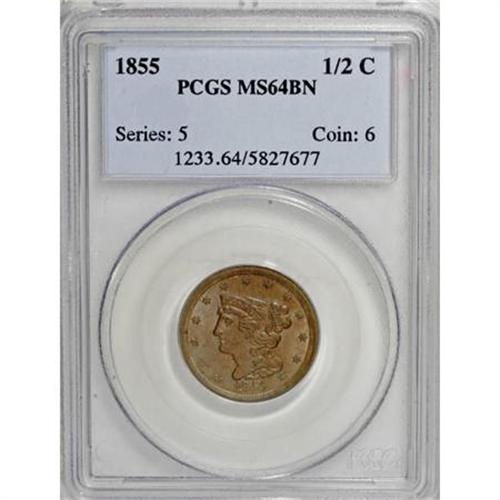<B>1855 1/2 C Slanted 5 MS64 Brown PCGS.</B></I> PCGS Population (91/32). NGC Census: (156/80). Mintage: 56,500. Numismedia Wsl. Price for NGC/PCGS coin in MS64: $452. (#1233)<BR><BR><B>Coin Engraver:</B> Christian Gobrecht<BR><BR><b>Shipping:</b> Coins & Currency (<a target="_blank" href="http://www.heritageauctions.com/common/shipping.php">view shipping information</a>\)