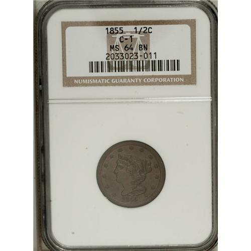 1855 1/2 C MS64 Brown NGC. C-1, B-1, R.1. Sharply stru