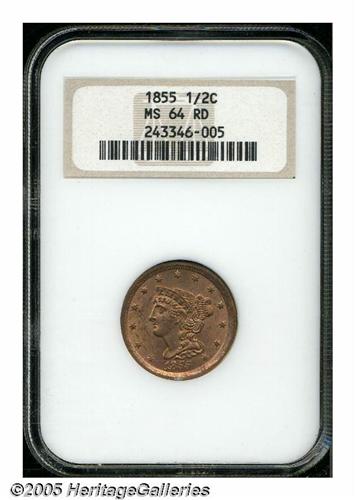 1855 1/2 C MS64 Red NGC. B-1, C-1, R.1. Nicely st