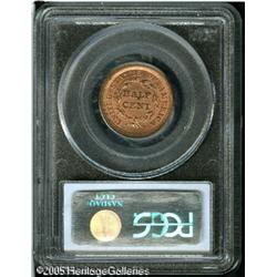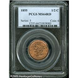<B>1855 1/2 C MS64 Red PCGS.</B></I> B-1, C-1, R.1. Bright reddish-orange color with some minor staining on the reverse. The design elements are well struck up, except some of the stars along the right obverse border are soft in the center. Lot:5095