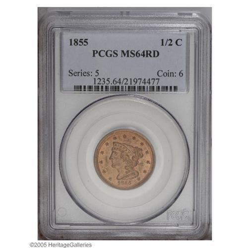 1855 1/2 C MS64 Red PCGS. B-1, C-1, R.1. This brick-re 1855[1/2 C] MS64 Red PCGS.