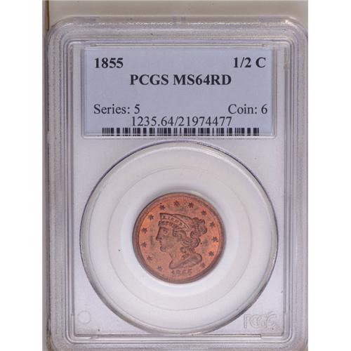 1855 1/2 C MS64 Red PCGS. C-1, B-1, R.1. This brick-re