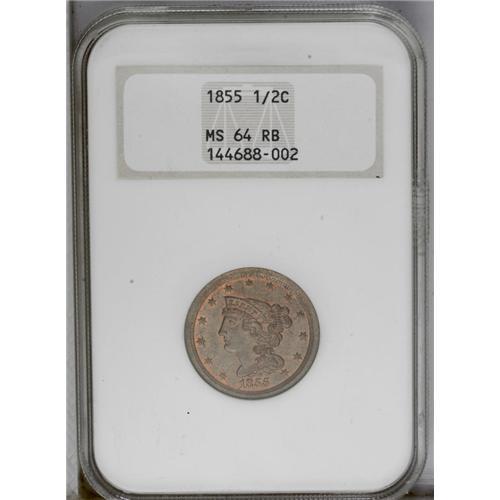 1855 1/2 C MS64 Red and Brown NGC. C-1, B-1, R.1. Stee 1855[1/2 C] MS64 Red and Brown NGC.