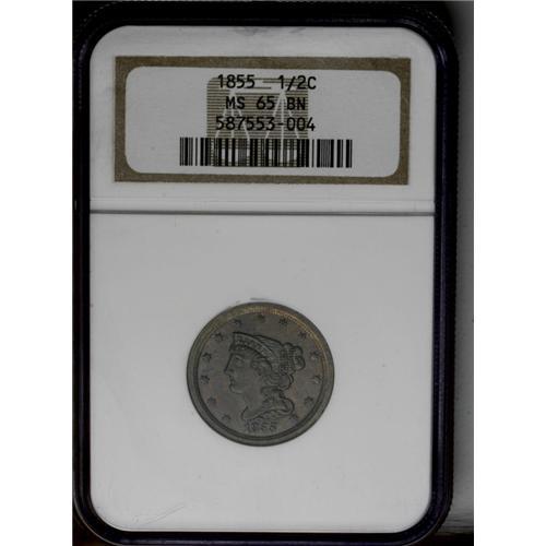 1855 1/2 C MS65 Brown NGC. C-1, B-1, R.1. A lovely Gem