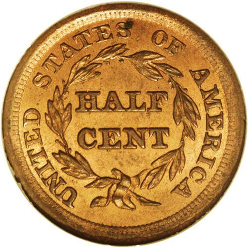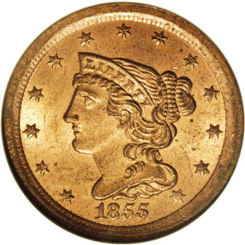 <B>1855<1/2 C> MS65 Red NGC.</B></I> C-1, B-1, R.1. Ex: Foxfire. This example has fully lustrous mint red color on both sides with excellent eye appeal. Like nearly every example of this date in similar quality, a few minor black flecks can be seen on both sides, with a small greenish corrosion spot at the upper reverse. Otherwise, both sides have pristine surfaces. EAC 63+. Census: 9 in 65, 0 finer (9/06).