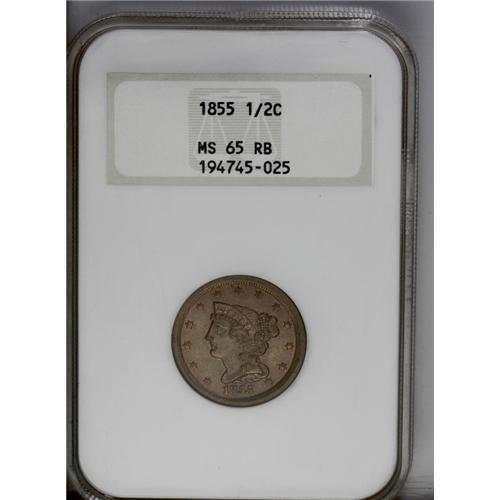 1855 1/2 C MS65 Red and Brown NGC. More Brown than Red