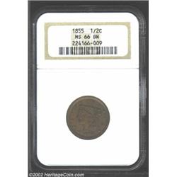 1855 1/2 C MS66 Brown NGC. B-1, C-1, R-1. The only dies. Rich tan-brown in patina, with hints of faded original orange color at the borders. The surfaces are exquisitely preserved. Stars 10 to 13 are not fully struck, but the portrait and wreath are bold. No 1855 Half Cents have been graded higher by either NGC or PCGS. NGC has an MS66 population of 7 coins as Brown, with another 2 examples encapsulated as Red and Brown. No Red specimens have been certified above MS65. Important notice: We expect to be auctioning lots at the rate of 200-250 per hour. Sometimes eBay Premier live bid software cannot keep up with that pace, so we strongly recommend that you place a realistic proxy bid now as insurance to avoid disappointment. Also please note that all Heritage/CAA lots purchased through eBay Premier carry a 20% Buyer's Premium. Please make sure you read the Terms and Conditions.
