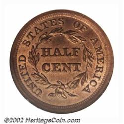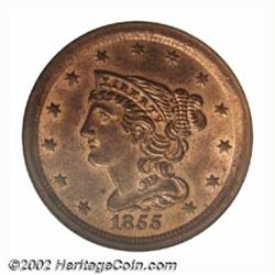 1855 1/2 C MS66 Red and Brown NGC. B-1. Both sides of this frosty textured example possess dominant cherry-red luster. Some mottled patination in medium brown shades confirms the color designation with the silky-smooth surfaces upholding the validity of the MS66 designation. The strike sharpens considerably toward the centers of this exceptionally well preserved Coronet Half Cent. A tiny spot in the obverse field before the truncation of Liberty's neck is noted. Population: 2 in 66 Red and Brown, 0 finer (7/02). Important notice: We expect to be auctioning lots at the rate of 200-250 per hour. Sometimes eBay Premier live bid software cannot keep up with that pace, so we strongly recommend that you place a realistic proxy bid now as insurance to avoid disappointment. Also please note that all Heritage/CAA lots purchased through eBay Premier carry a 20% Buyer's Premium. Please make sure you read the Terms and Conditions.