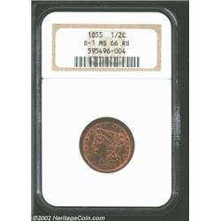 1855 1/2 C MS66 Red and Brown NGC. B-1. Both sides of this frosty textured example possess dominant.