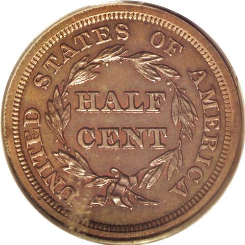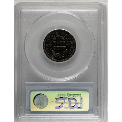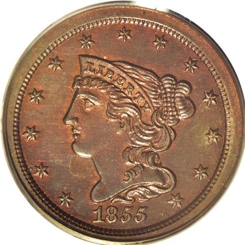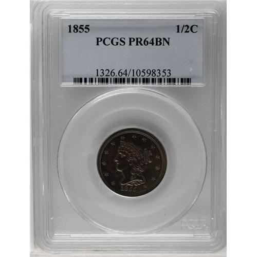 <B>1855<1/2 C> PR64 Brown PCGS.</B></I> B-1, C-1, the only known dies, R.5 as a proof. Walter Breen's proof census estimated that 35 to 40 proofs have survived. This lovely piece displays boldly defined design elements and reddish-purple toning with blushes of lime-green and gold-tan. Excellent field to motif contrast is noted when the coin is rotated beneath a light source. Close scrutiny reveals no significant contact marks or hairlines, just a tiny unobtrusive fleck or two. EAC PR60+. Population: 6 in 64 Brown, 2 finer (6/06).