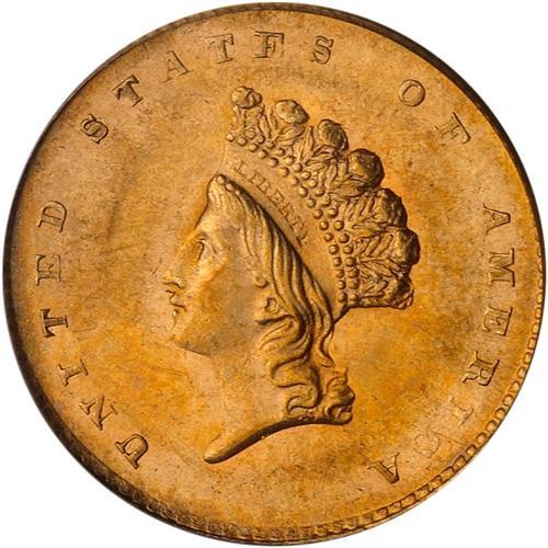 With a mintage of 758,000. Brilliant luster and lightly clashed dies, orange gold, almost orange peel in color. No disturbing marks of any sort on this specimen. Bid $9100, trends at $15,000.