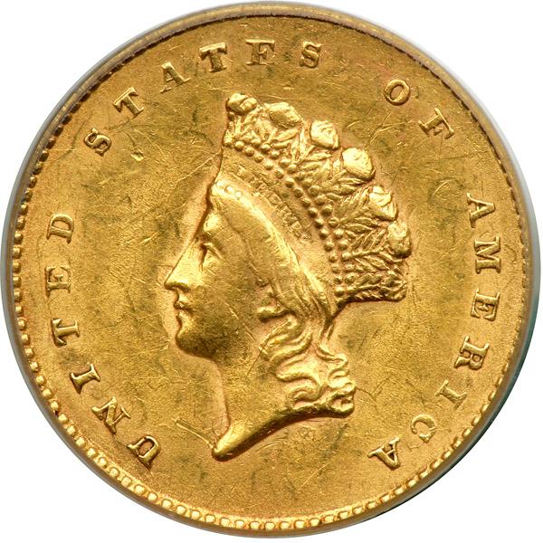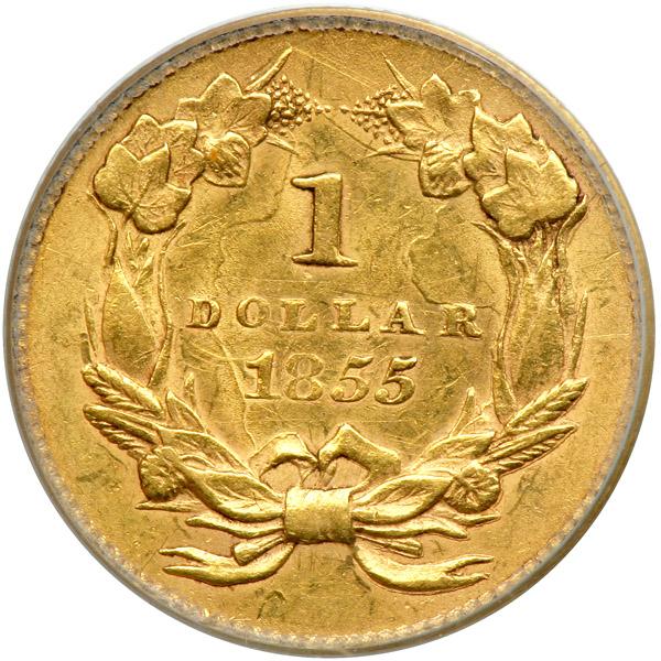 1855 $1 Gold Indian. PCGS graded AU-55. CAC Approved. Light golden toning (PCGS # 7532) .