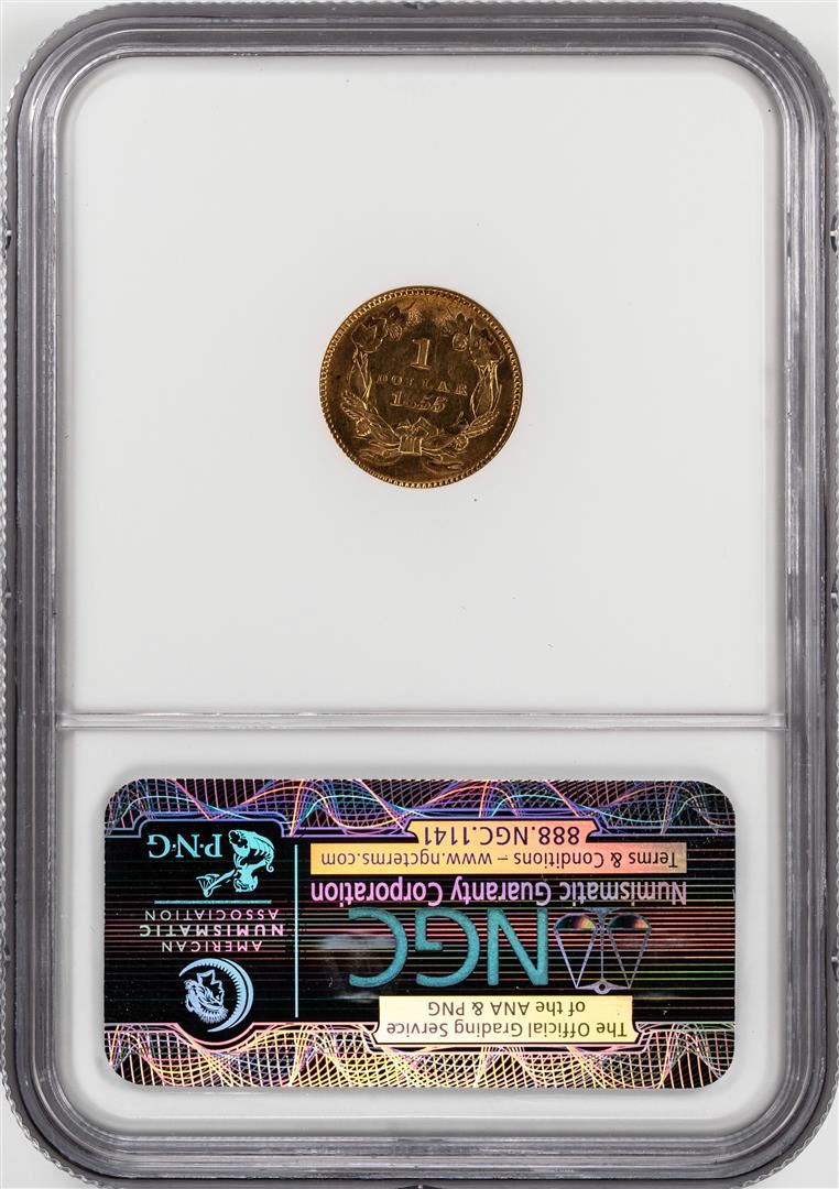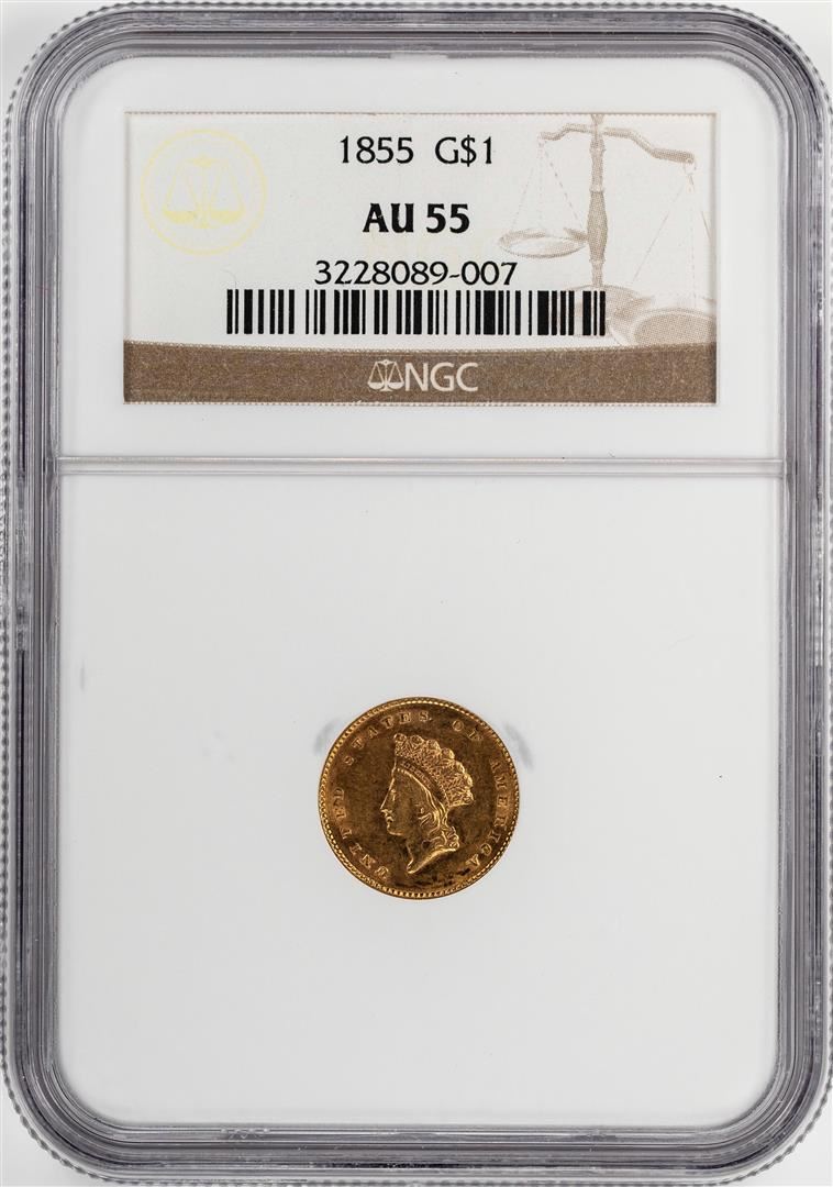 One 1855 $1 Indian Princess Head Gold Dollar Coin NGC AU55. NGC Certified.